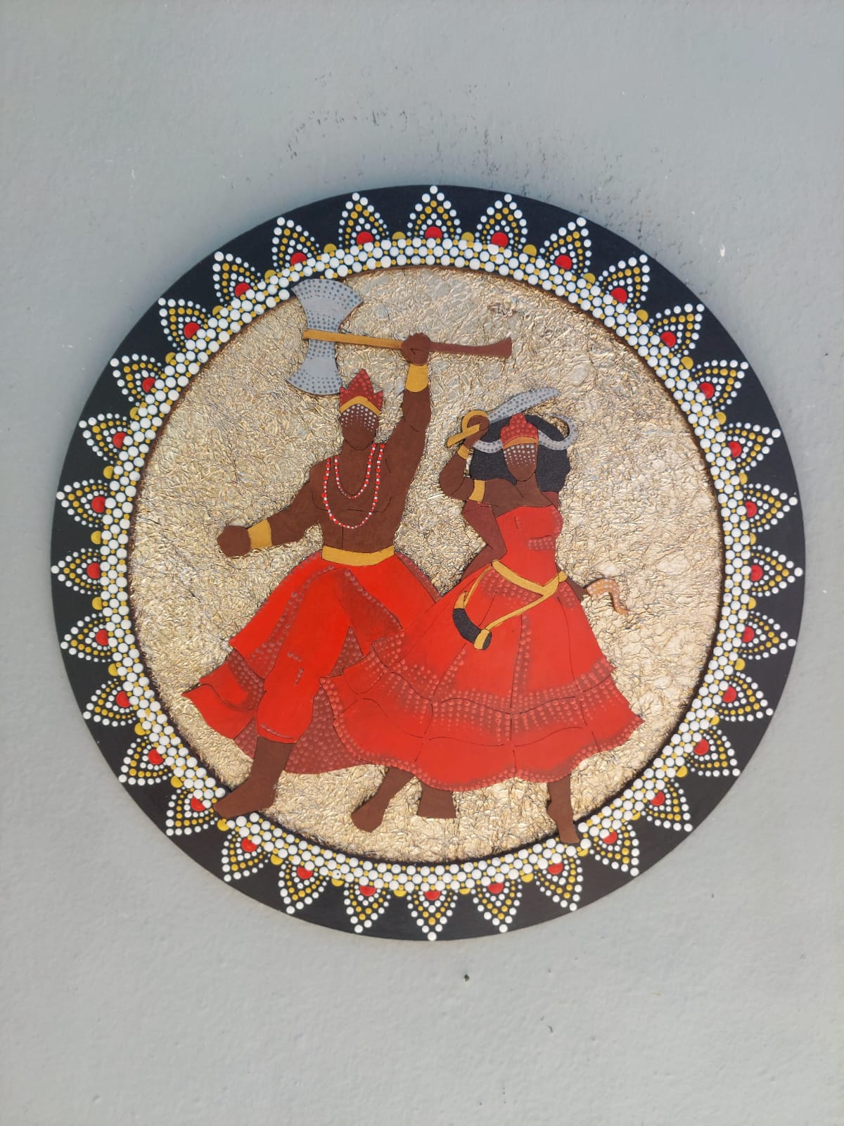 A peça combina pontilhismo manual, recorte a laser e fundo dourado texturizado, criando profundidade e um efeito único de luz.