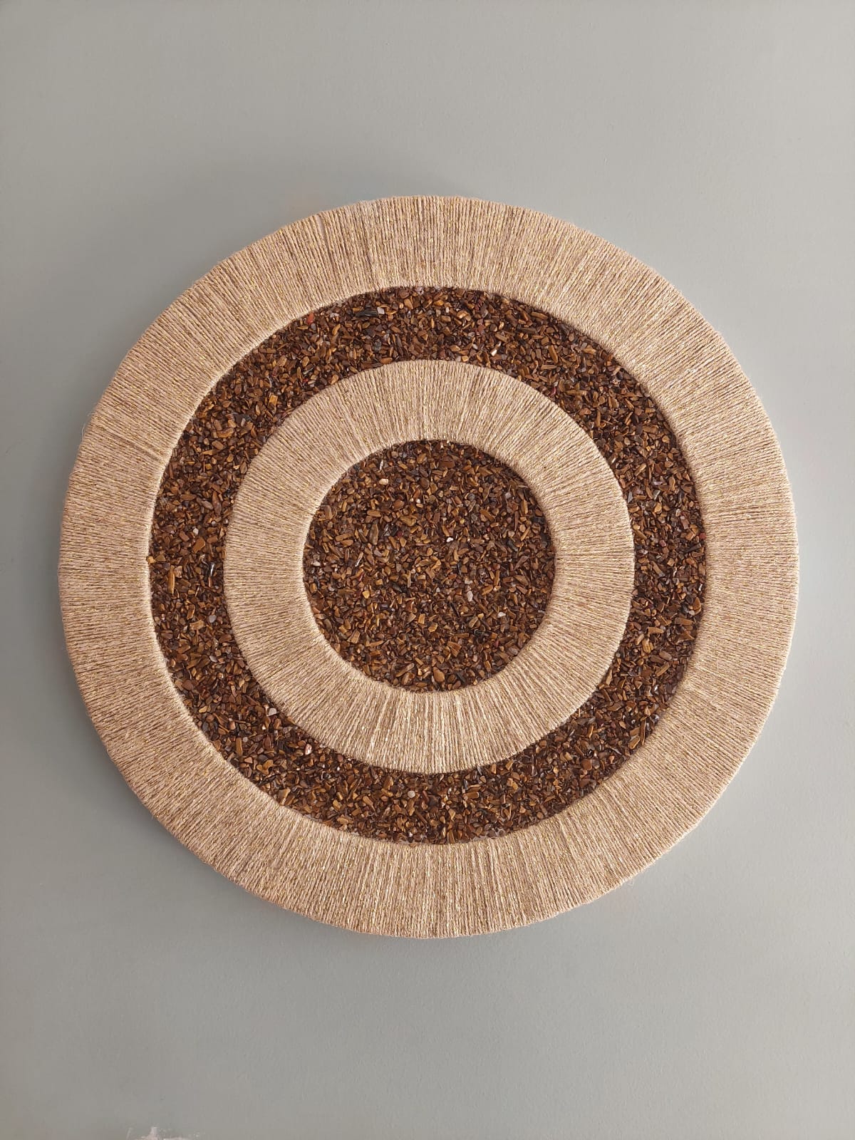 Os círculos concêntricos criam um movimento visual hipnotizante, representando expansão, equilíbrio e conexão entre centro e exterior. A textura orgânica das pedras contrasta com a delicadeza da trama em juta, resultando em uma obra contemporânea com essência natural e atemporal.