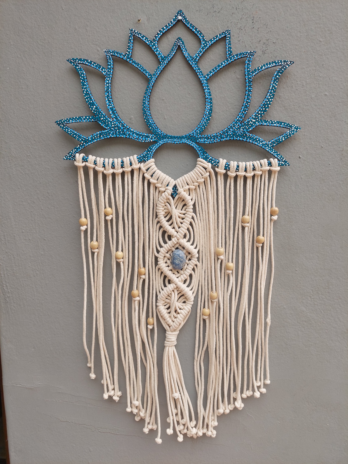 Este painel decorativo une pontilhismo e macramê em uma composição única. Com um recorte a laser da Flor de Lótus pintado em tons de azul, a peça é complementada por uma franja de macramê em cordão 100% algodão na base.